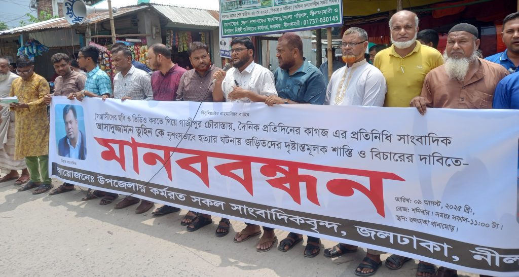 গাজীপুরে সাংবাদিক তুহিন হত্যায় জড়িতদের ফাঁসির দাবীতে জলঢাকায় মানববন্ধন ও সমাবেশ অনুষ্ঠিত।