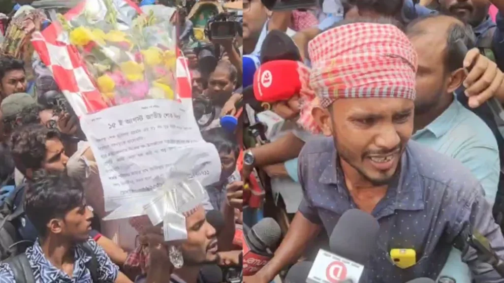 তাকে দেখেই আওয়ামী লীগ আওয়ামী লীগ বলে চিৎকার করতে থাকে লোকজন। তাদের মধ্যে উপস্থিত এক ব্যক্তি ওই রিকশা চালকের হাত থেকে ফুলের তোড়া টেনে নিয়ে ছিঁড়ে ফেলেন। ফুলের তোড়ায় লেখা ছিল ‘১৫ আগস্ট জাতিয় শোক দিবস।’